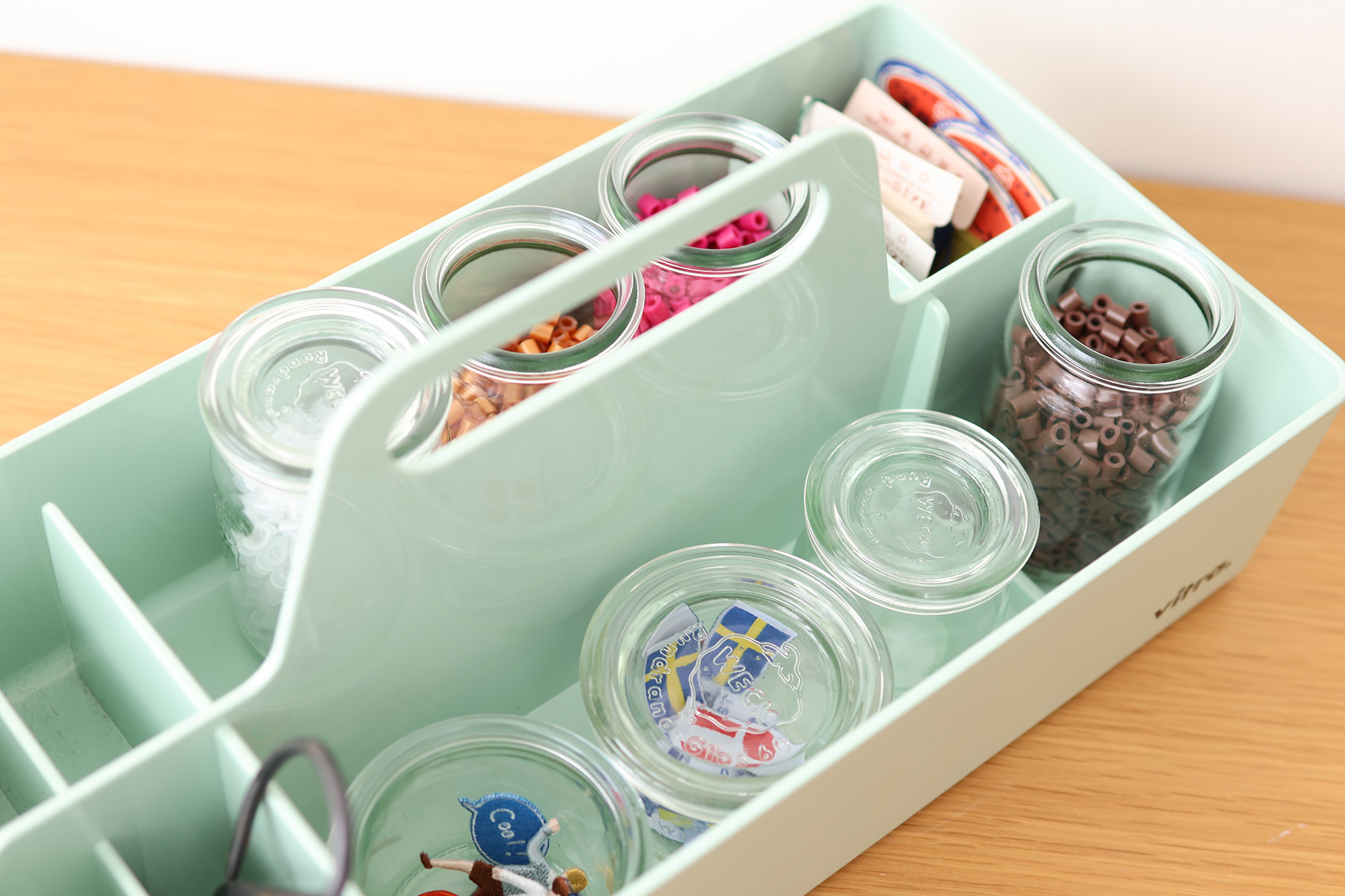 カラフルでこまごましていて、なかなかすっきりとさせづらい遊び道具の収納ですが、子どもたちはすぐに遊べておかたづけしやすく、大人にも入っているものが見えるうえ、WECKだったらちょっとうれしい。お互いよい気分で過ごせそうです。ぜひやってみてください!